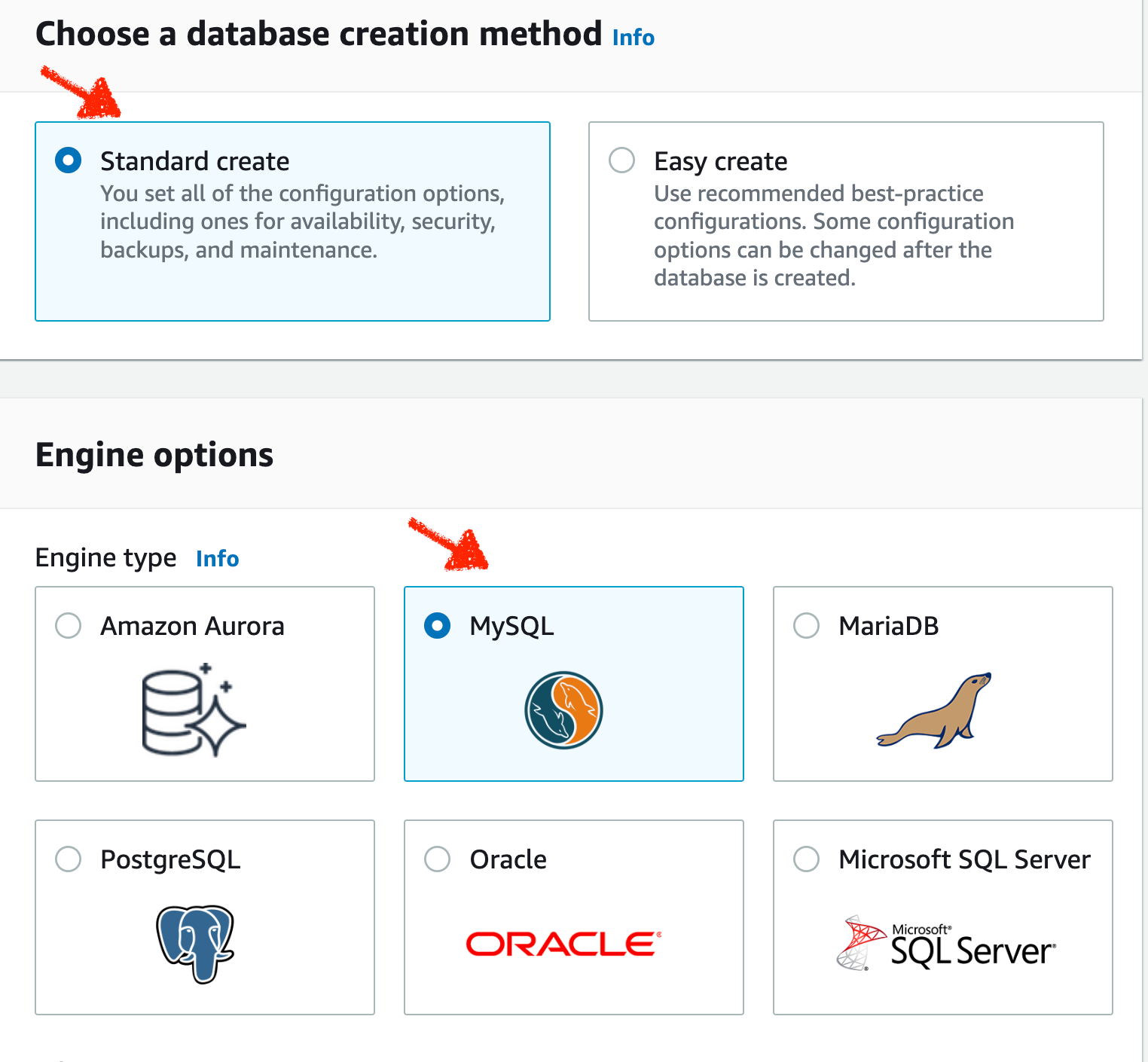 - Choose "RDS" in AWS management console, and choose "Create database"